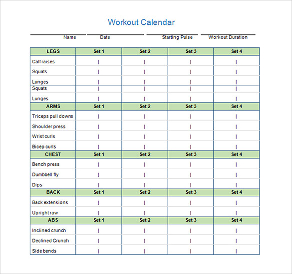 Use printable calendar workout templates. There are two versions of the. Four downloadable, printable, free workout plan templates. Fitness goal & wellness chart. While not everyone chooses to write these .